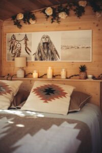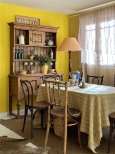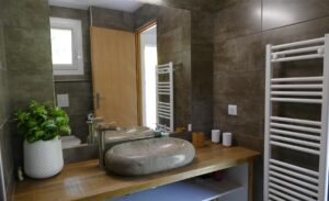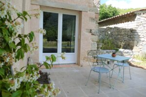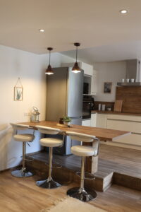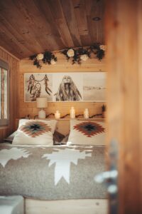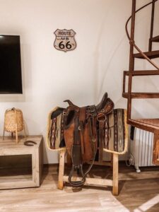 The apartment… (L’Ecurie) Our third accommodation option is a charming apartment, thoughtfully converted from a former stable. It features a fully equipped kitchen seamlessly integrated with the living area, offering all the comforts of modern living with a rustic twist. A striking metal staircase leads you to a cozy, Western-style bedroom on the upper level, where every detail reflects the spirit of the Wild West. Immerse yourself in the warm, authentic atmosphere and feel right at home in this unique retreat.